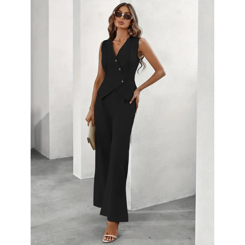 Das ärmellose Top besticht durch einen asymmetrischen Schnitt mit subtilen Knopfdetails und praktischen aufgenähten Taschen, die einen zeitgemäßen und luxuriösen Look verleihen. Die weite Hose fällt sanft und bietet optimale Bewegungsfreiheit.