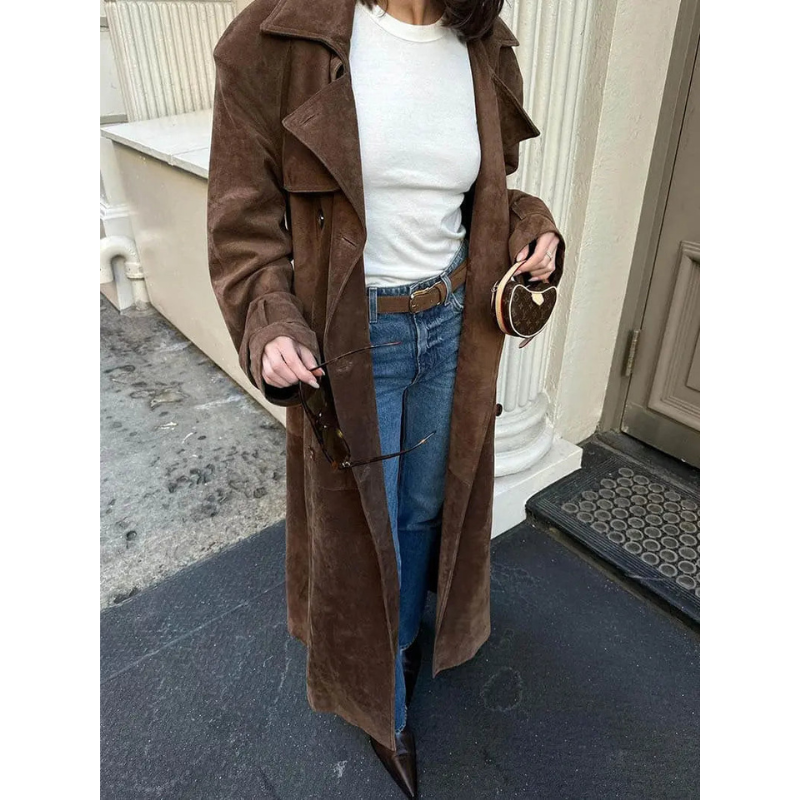 Der SiennaSuede Luxe Trenchcoat ist eine elegante Neuinterpretation des klassischen Trenchcoats, perfekt für moderne Frauen, die Raffinesse schätzen. Hergestellt aus weichem Suède-Look-Stoff, bietet er ein luxuriöses Finish und angenehmen Tragekomfort.