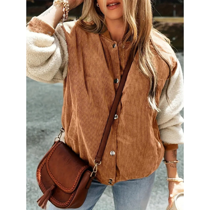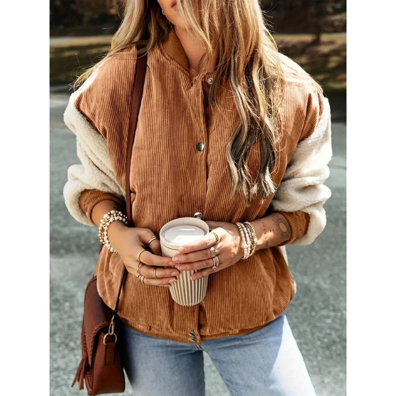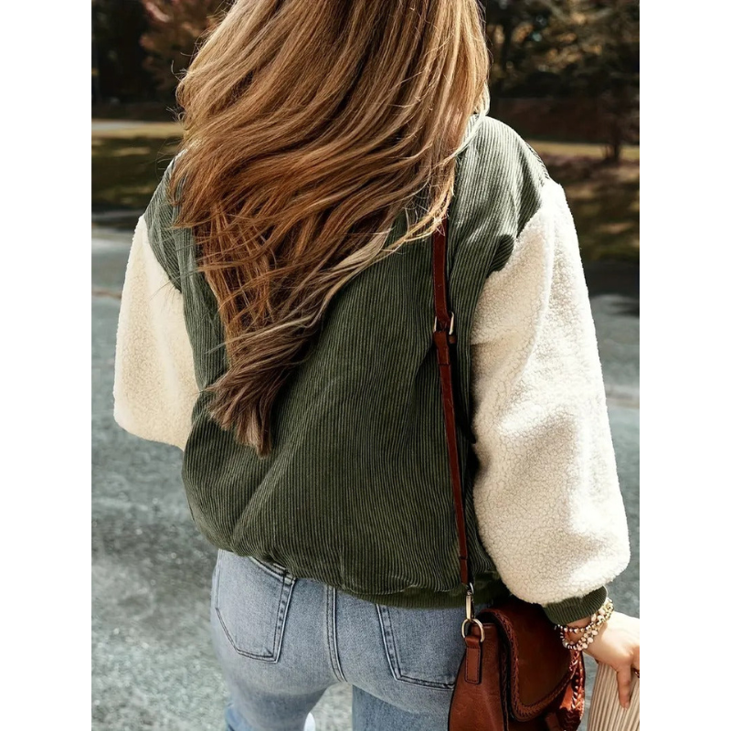 Der Stehkragen und die Rippbündchen mit subtilen Kontrastakzenten verleihen ihr eine zeitlose, feminine Note. Praktische Druckknöpfe auf der Vorderseite und zwei Hüfttaschen sorgen für Funktionalität und Tragekomfort.