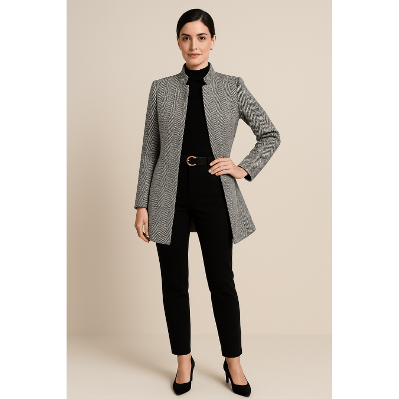Die taillierte Passform betont subtil die Silhouette, während die weiche synthetische Mischung angenehme Wärme an kühlen Herbst- und Wintertagen bietet. Kombiniere ihn mit einer Hose und Bluse oder trage ihn lässig über Jeans und Stiefeln – der Elena Mantel verleiht jedem Outfit mühelos Raffinesse und Balance.