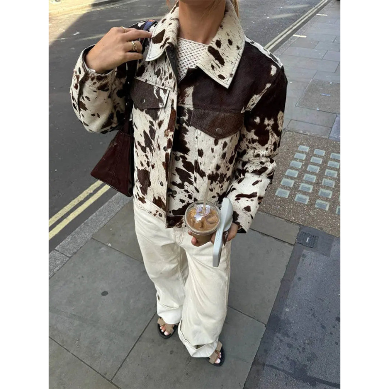 Der NovaCow-Mantel ist für Frauen, die auffallen und nicht im Hintergrund verschwinden möchten. Sein weicher Wildleder-Look in charakteristischer Kuhfell-Optik verleiht der Jacke einen ausgeprägten Charakter, der sofort die Aufmerksamkeit auf sich zieht. Mit einem Erscheinungsbild, das modernen Streetstyle und western-inspirierten Stil perfekt balanciert, ist dies ein Statement-Piece für alle, die ihren Stil mit Mut tragen.