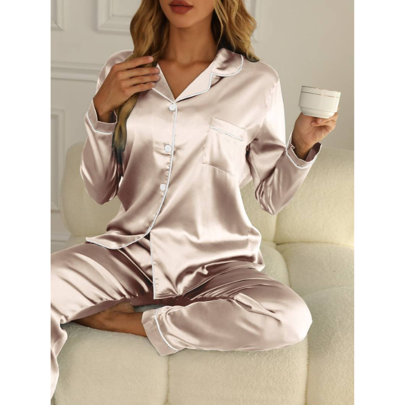 Erleben Sie mit dem Celeste Luxe Satin-Pyjamaset für Damen die perfekte Kombination aus Eleganz und Komfort. Dieses raffinierte Nachtwäsche-Set wurde speziell für Frauen entworfen, die auch in entspannten Momenten Stil schätzen. Der seidig weiche Stoff umhüllt Sie und strahlt Luxus aus – ideal für entspannte Nächte und stilvolle Morgen.