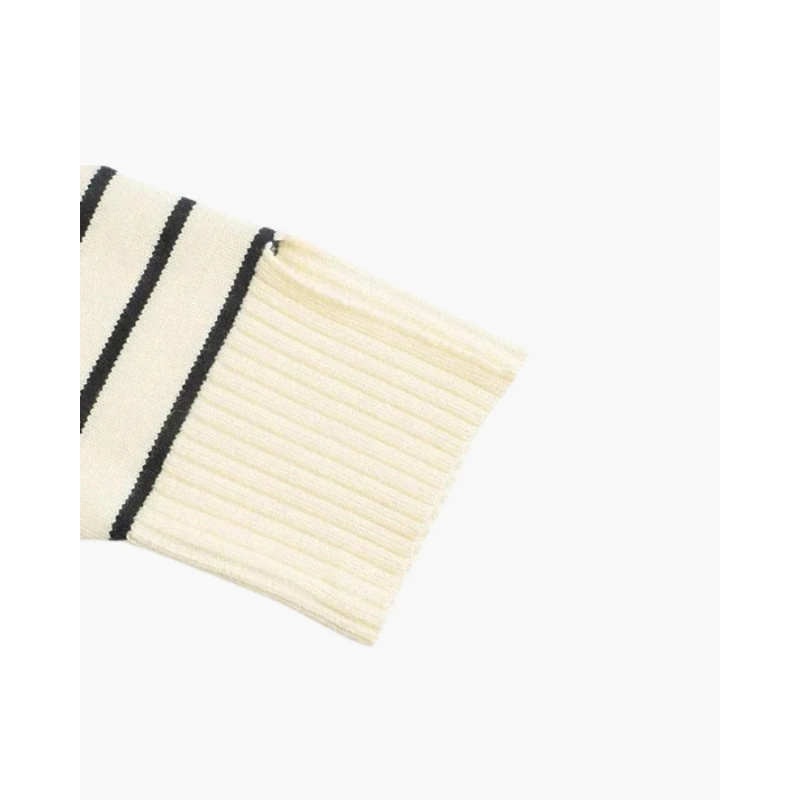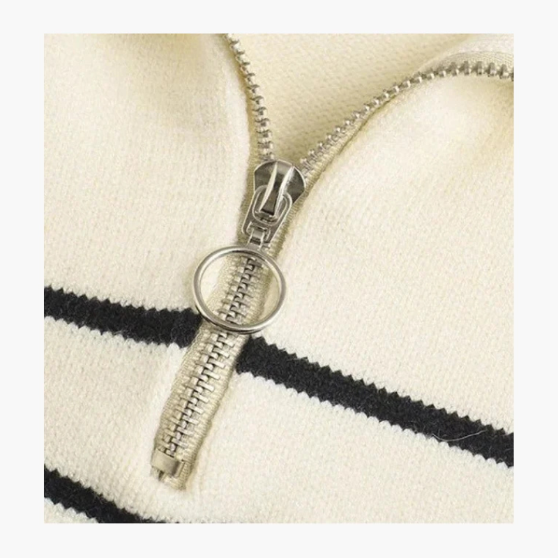 Entdecken Sie den Old Money Damen Vintage Chic Strickpullover – ein zeitloses Kleidungsstück mit nostalgischem Flair. Dieser cremefarbene und blau gestreifte Pullover besticht durch einen stilvollen Reißverschluss, der das Wesen des Old Money-Stils perfekt einfängt.