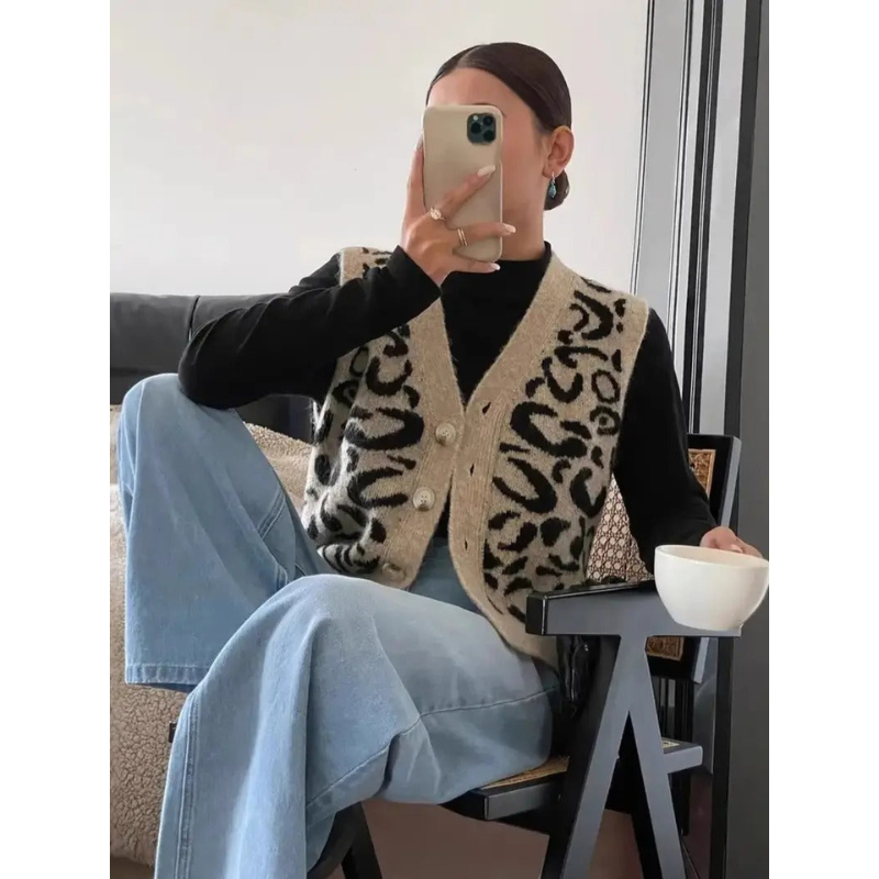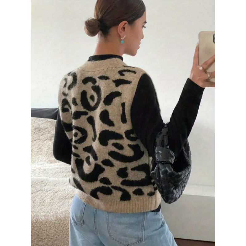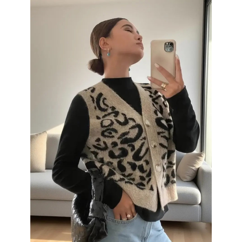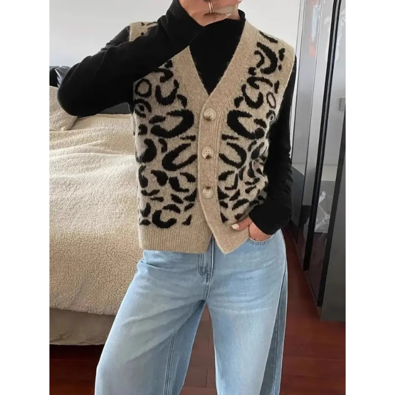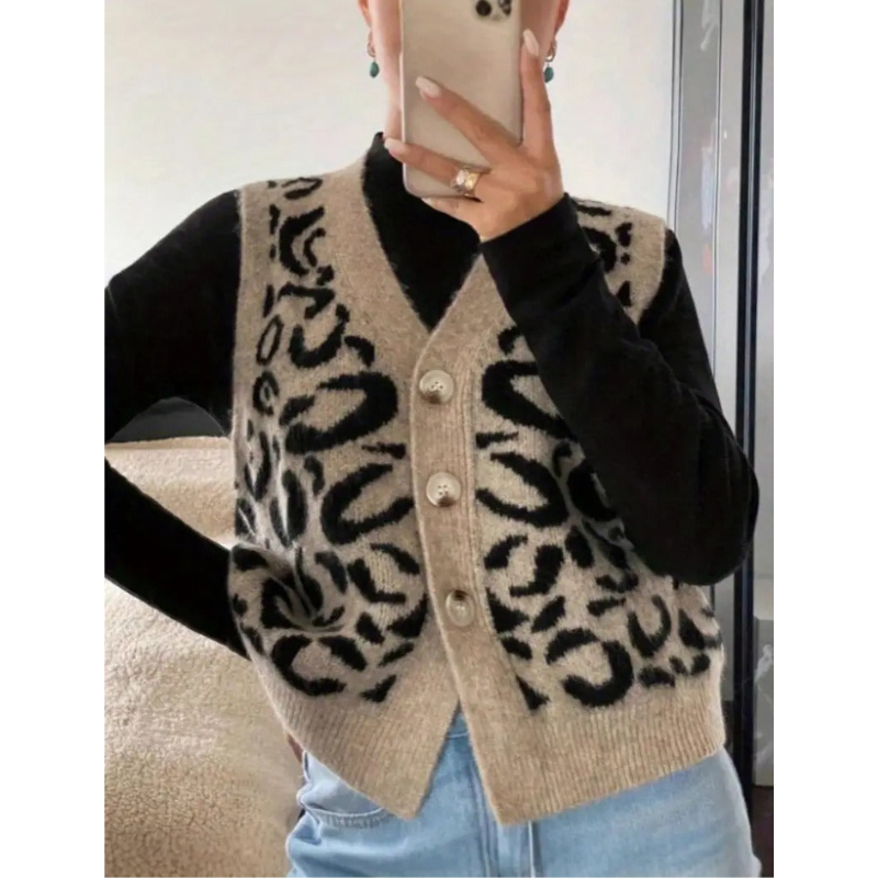 Die Damen Ärmellose Weste mit Leopardenmuster – V-Ausschnitt ist das perfekte Kleidungsstück, das Verspieltheit und Eleganz vereint. Mit ihrem auffälligen Tiermuster und gepflegten Details wird diese Weste zum echten Hingucker in deiner Garderobe.