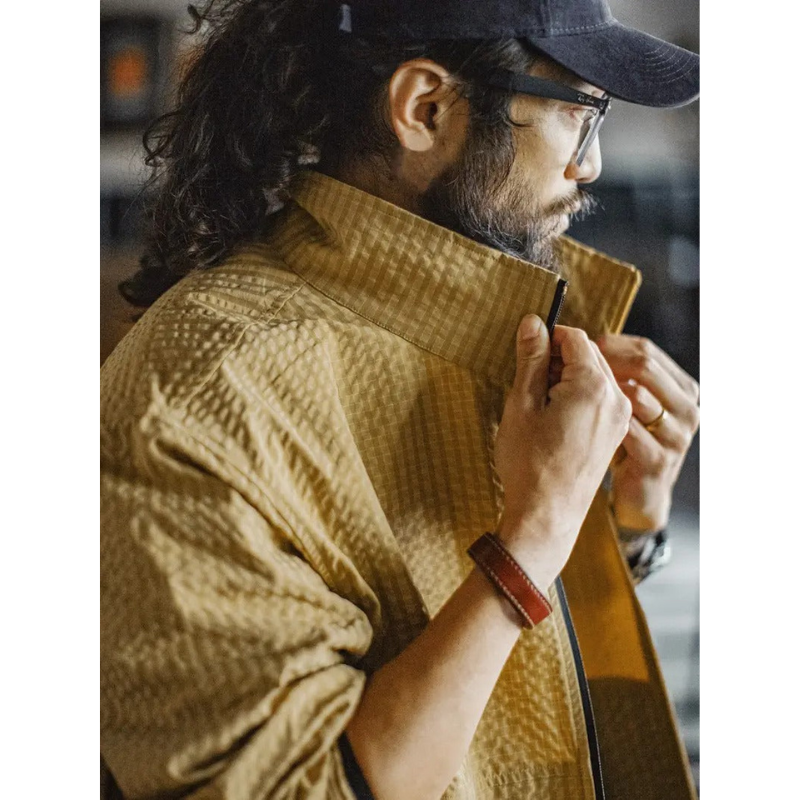 Diese Herrenjacke besticht durch ihr hochschließendes Kragen-Design und den durchgehenden Reißverschluss, der sowohl Komfort als auch Benutzerfreundlichkeit bietet. Die gewebte Karostruktur verleiht der Jacke einen markanten und eleganten Look.