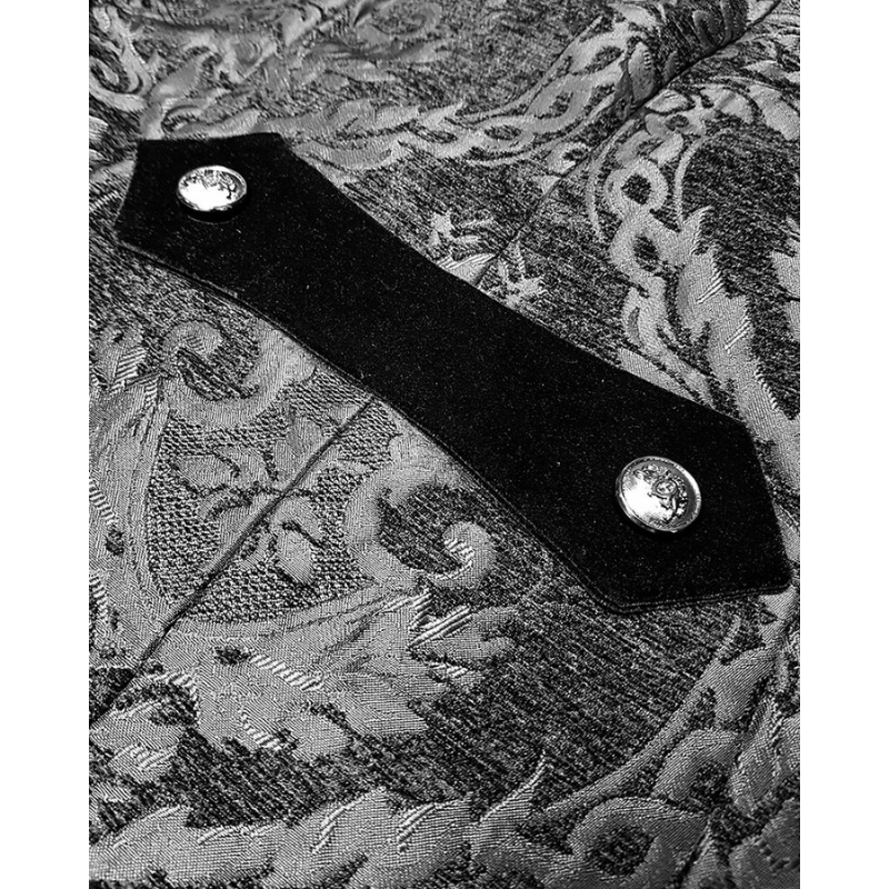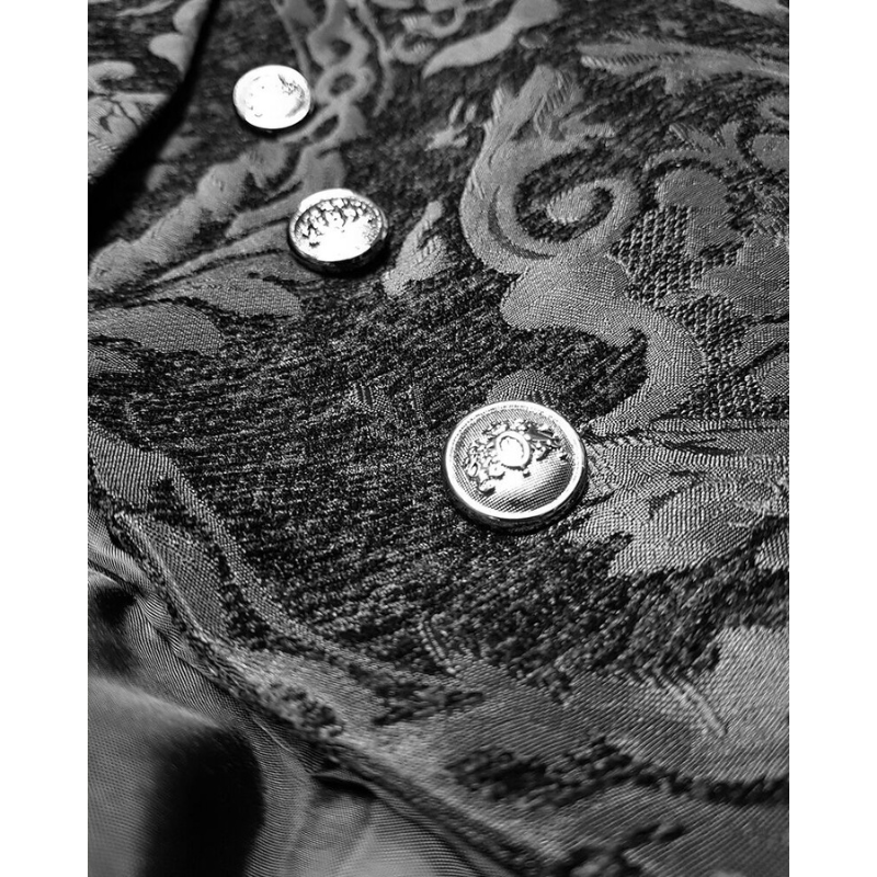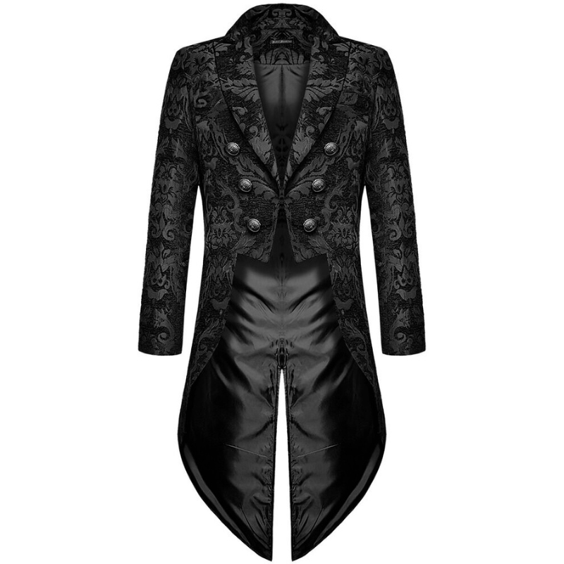 Eleganter Herrenfrack im viktorianischen Stil – für den stilbewussten Mann, der Klasse und Eleganz schätzt. Das reich gewebte Brokatmuster und die doppelte Knopfreihe verleihen dieser Jacke eine königliche Ausstrahlung. Die längere Rückseite im Cutaway-Stil sorgt für eine raffinierte Passform, die Charakter zeigt.