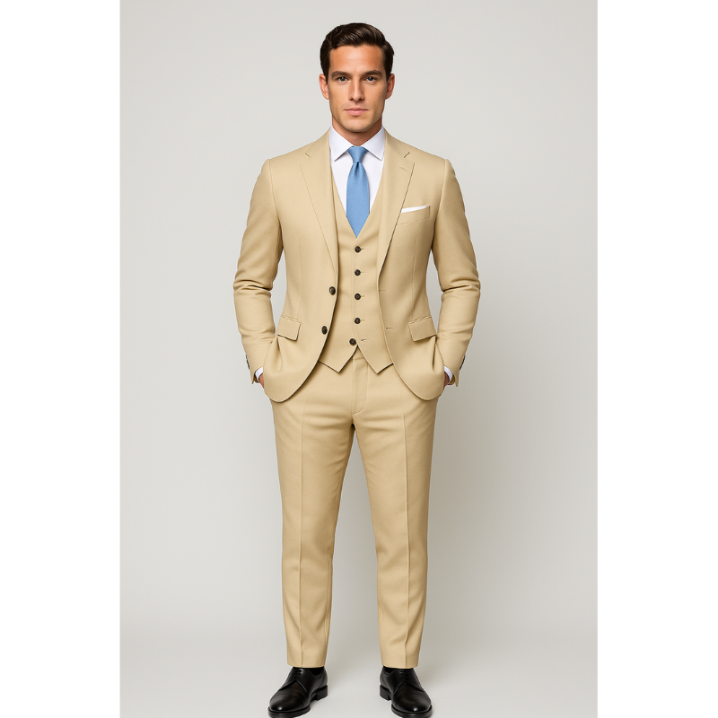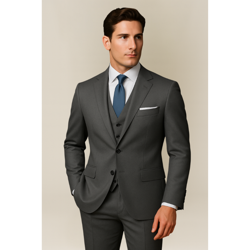 Eleganz trifft Stärke – Der dreiteilige Herrenanzug in Dunkelgrau oder Beige ist perfekt für Männer, die sowohl im Berufsleben als auch bei formellen Anlässen Eindruck hinterlassen möchten.